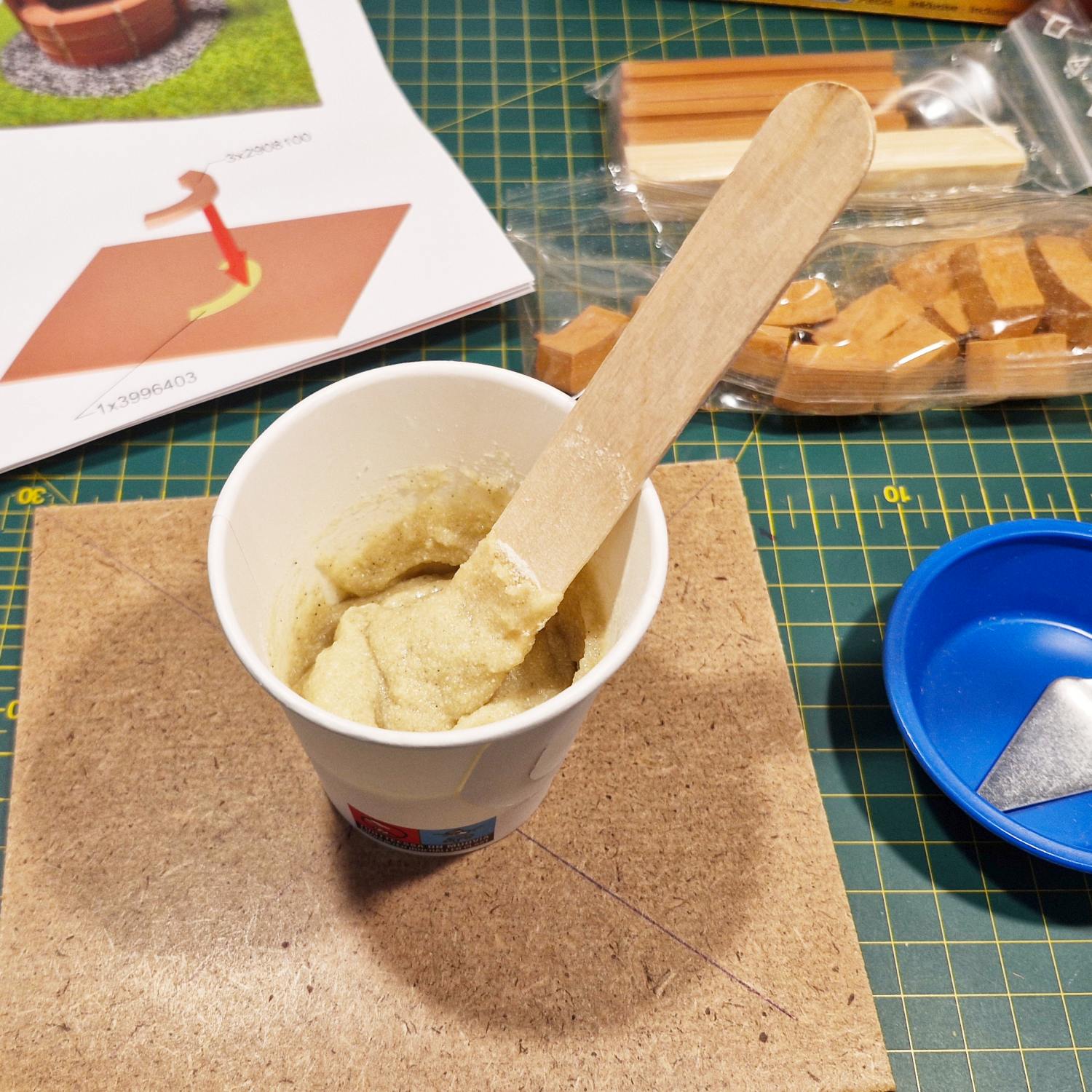 Liimaksi voi käyttää Noch ruoholiimaa, mutta Tacky Glue soveltuu myös. Tacky Gluen kanssa on kuitenkin syytä tehdä pieniä alueita kerrallaan, sillä liima kuivuu nopeasti, jolloin ruoholla on lyhyempi aika kiinnittyä.